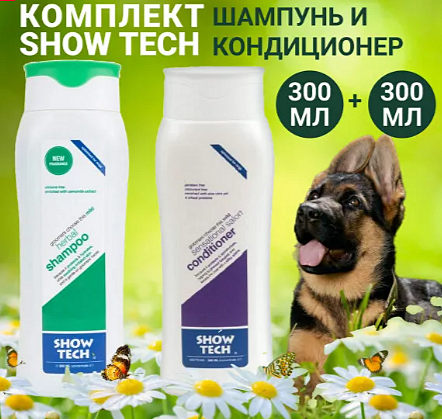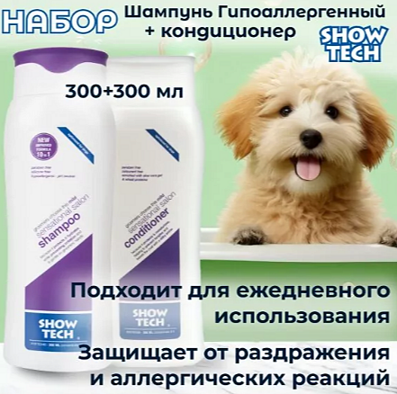 - ShowTech (Бельгия) гипоаллергенная серия кондиционер и шампунь (есть разный объем: 100, 300 мл и 5л), в магазине GROOMERU можно приобрести сразу набором.